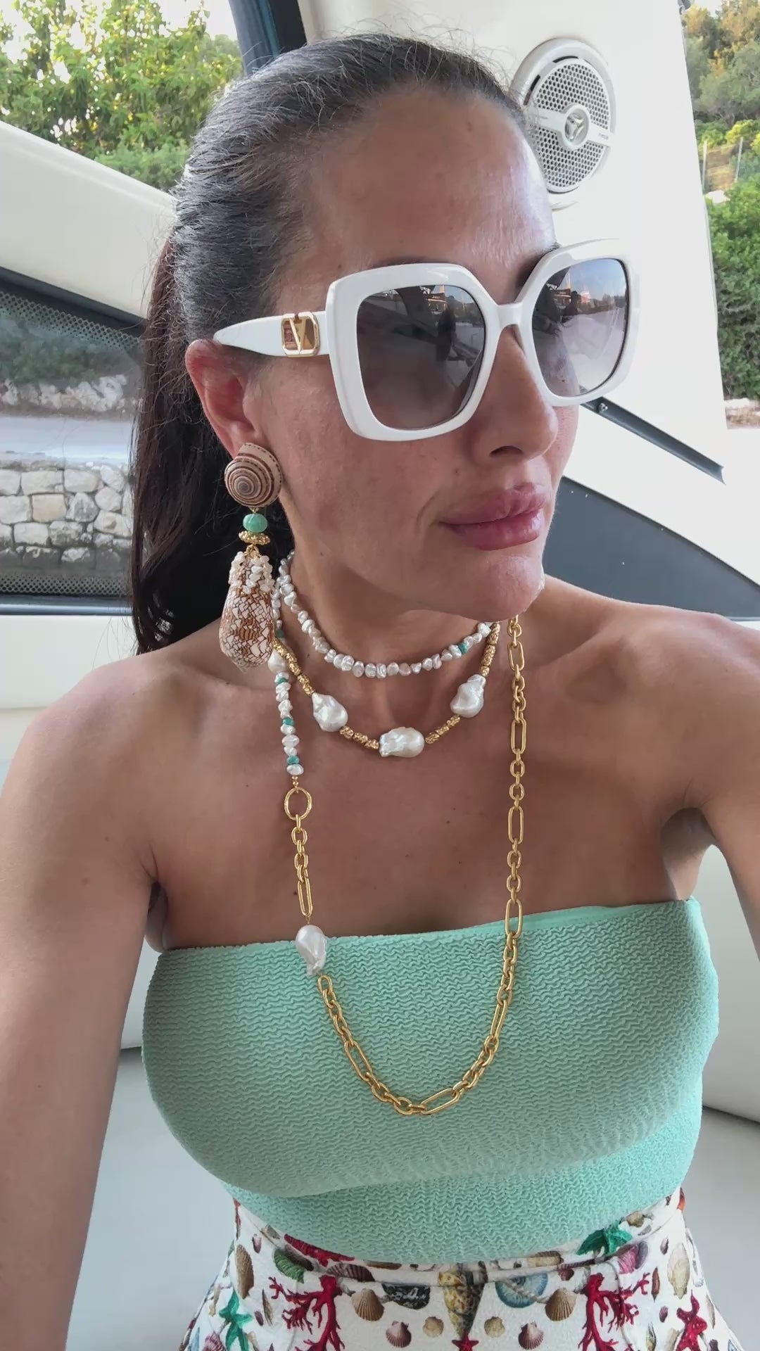- 2 large natural baroque pearls, 80 x irregular natural pearls and 8 x gemstones with a link chain designed by Jimena and made by hand by her skilled artisans.